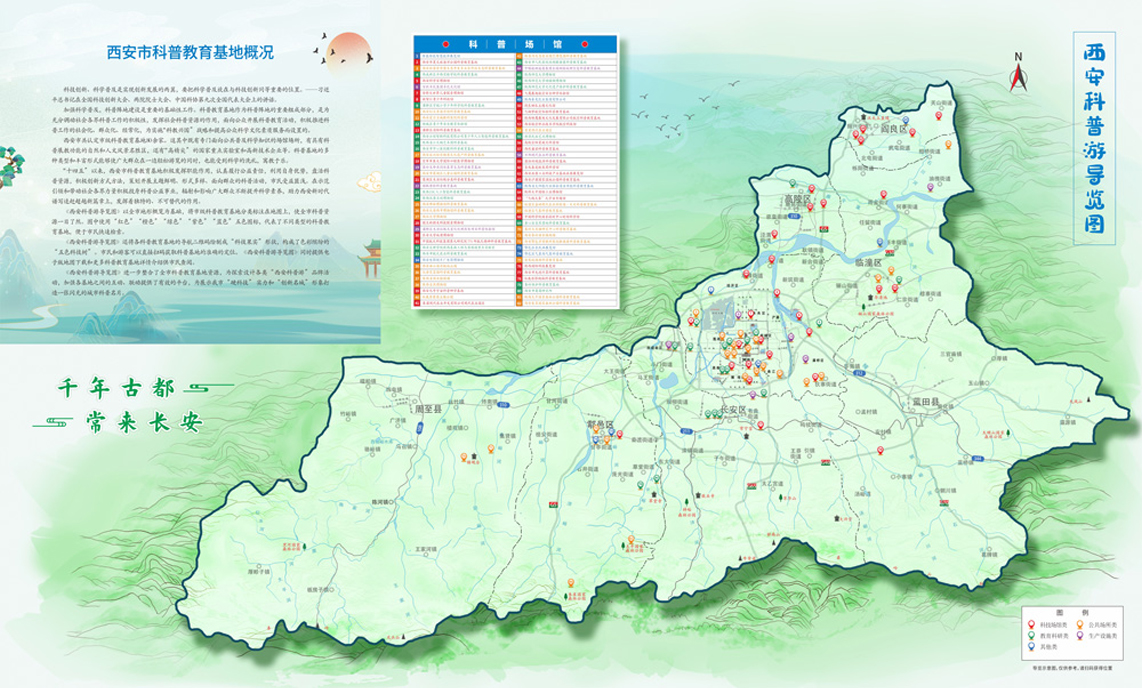 《西安科普游导览图》以全市地形概览为基础,将市级科普教育基地分类标注在地图上,使全市科普资源一目了然。图中使用“红色”“橙色”“绿色”“紫色”“蓝色”五色图标,代表了不同类型的科普教育基地,便于市民快速检索。