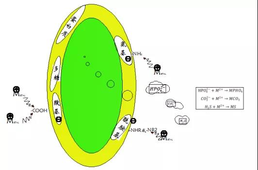 表面吸附是指微生物表面的负电荷官能团吸附金属阳离子的过程。在重金属污水中,通常情况下金属离子为阳离子,阳离子会不断地寻求机会与阴离子结合。恰恰微生物细胞壁表面存在硫基、磷酸基、羟基、羧基等官能团,使微生物表面具备“负电荷”,这些官能团能为金属离子提供配位络合的电子对,使金属被吸附在细胞壁上,如图1所示。除此之外,微生物还可通过离子交换、表面络合等方式“收集”金属。