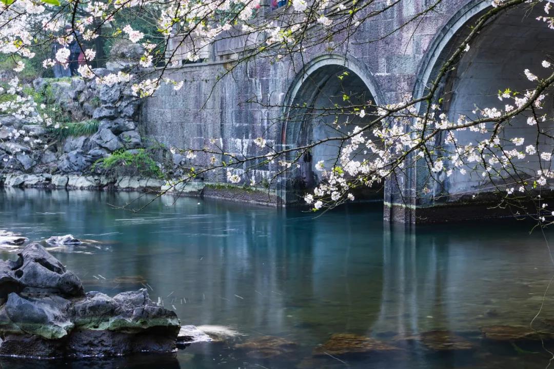几株樱树悄悄戏水,片片花瓣散落在水中,从桥洞望去,宛如画中景。
