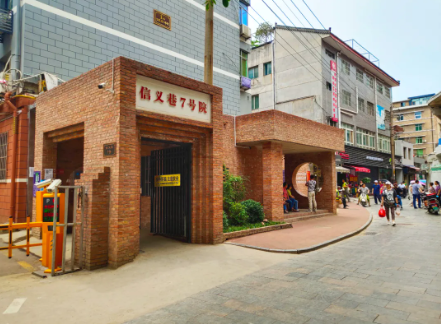 这里有部分建国初期留下来的老式建筑。为了凸显信义巷的老旧历史,在改造过程中,着重改善街巷环境和完善城市功能,对沿街围墙墙面进行整体提升,通过打磨、镂空等方式显露原有的红砖质感,并重新砌筑青砖外墙,路面用青石铺砌,与街巷的红砖和青砖相映衬,承载街巷岁月的印记。