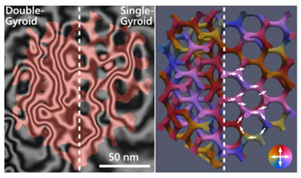 陀螺仪吸引了很多人的兴趣,因为尽管它们很复杂,但它们可以从精心配制的聚合物组合中自组装,这些聚合物可以用作三维模具或模板来形成独立的纳米结构。当支柱连接成螺旋线时,陀螺仪有一种“利手”或手性,其形状使磁陀螺仪成为测试从曲率中出现新磁性预测的理想系统。对陀螺仪光学性质的测量,甚至表明陀螺仪可以具有拓扑特性,这与手征效应一起是目前开发新型自旋电子器件的热门课题。