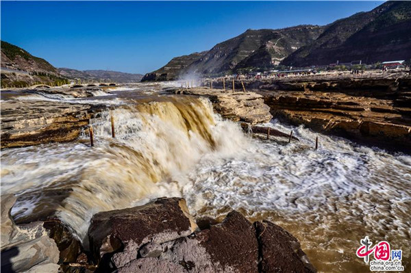 【点睛】站在壶口瀑布低洼处的岩石上,飞泻而下卷着黄沙的河水,如猛龙出江,惊涛骇浪势不可挡,震耳的涛声如吼,激荡水雾飞溅……