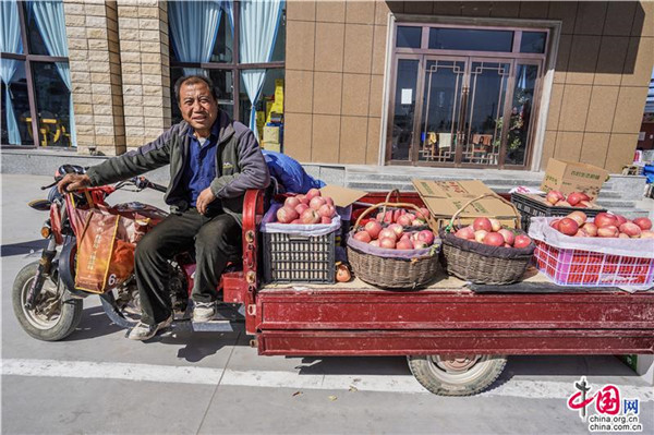 此时正是金秋收获的季节,苹果飘香杨家庄,老乡们在路边摆起了水果摊,一蓝蓝的大苹果煞是惹人,路边的果园里,红彤彤的苹果挂满枝,在一处果园中,高老汉和他的婆姨大概一早就开始了忙活,采下的苹果已堆成了小山,高老汉一个个的将坏果挑选出去。他婆姨拎着篮子穿梭在果树下,不一会儿就摘了沉甸甸一篮子。园子200棵果树结满了果子,但高老汉说,今年产量不如去年。这里的苹果都是现摘现销,高老汉家由她儿媳妇通过微信等网络方式销售,高老汉的婆姨不善言谈,但很爱笑,看着那满树的果子,丰收的喜悦在她脸上如阳光下绽放的花朵,可美了!