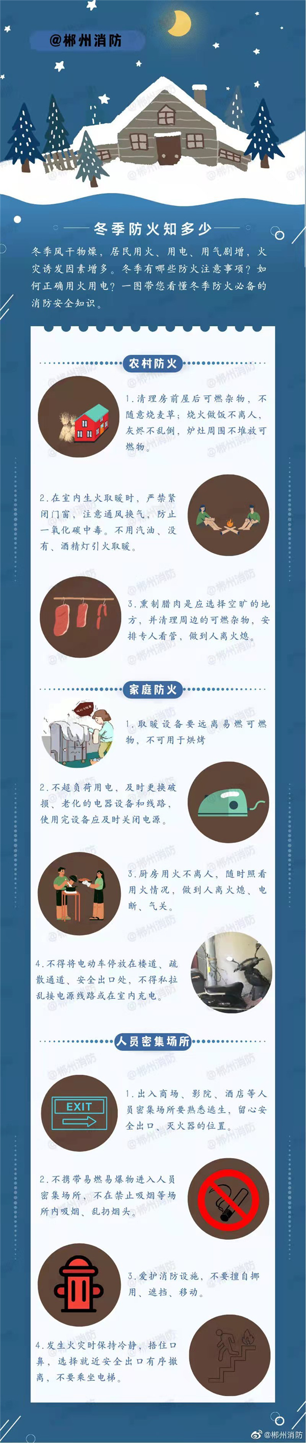 冬季天干物燥,是消防安全隐患较大的季节,农村、家庭、人员密集场所等都需要时刻提高警惕,做好防范措施,避免火灾事故的发生。冬季防火有哪些注意事项?如何正确用火、用电?看下图了解。