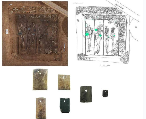 该墓长3.3米,宽3.2米,葬具为三联棺,带有头箱及边箱,随葬陶器数量据不完全统计超过300件。4人除一名儿童性别特征不明显外,其余均为男性,自北向南年龄呈递减之势,而随葬玉钺从类型、数量、玉质及大小等方面也表现出递减之势,不同墓主间表现出了明显的等级差异。