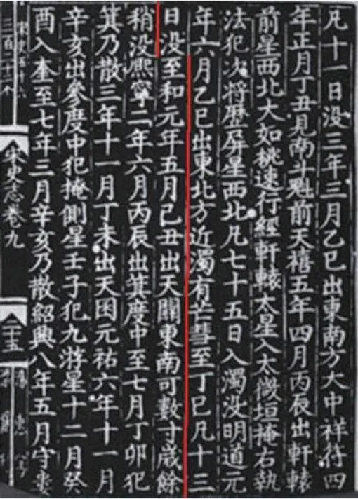 我国北宋时期,仁宗至和元年五月己丑(即公元1054年7月4日)的黎明前后,开封司天监的观察者发现,在东方的天关(即金牛座ζ)附近突然出现了一颗明亮的大星,其亮度比金星还要亮几倍,仅次于太阳和月亮(图2)。约23天后其亮度开始变弱,至消失不见持续了约两年的时间。由于出现在天关附近,宋代的天文学家称其为“天关客星”,且司天监官员杨惟德向朝廷报告了此事。同时一些史学家也将其记录到史书中,目前能在《宋史·天文志-第九》、《宋史·仁宗本纪》、《宋会要》、《续资治通鉴》中找到相关记载。如《宋会要》中记载:“嘉祐元年三月,司天监言:‘客星没,客去之兆也’。初,至和元年五月,晨出东方,守天关,昼见如太白,芒角四出,色赤白,凡见二十三日”(图3)。