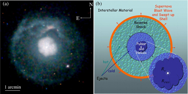 另一方面,在爆发的中心会残留一颗密度异常高的中子星(更大质量恒星的爆发时塌缩成黑洞)。有些中子星会快速旋转并从两极产生定向的辐射,观测上就表现为类似灯塔的脉冲星。蟹状星云中心就有一个转动周期为33毫秒的脉冲星(编号为PSR B0531+21),即一秒钟能转约30圈。脉冲星通常有强磁场,通过驱动极端相对论性的星风逐步释放其转动能,这些星风和介质、抛射物作用后也能产生电磁辐射,形成脉冲星风云。这种超新星遗迹壳层包含脉冲星风云的系统称为混合型超新星遗迹(图6)。
