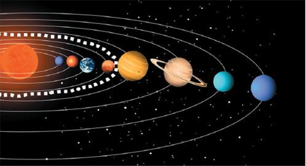 太阳系中太阳、八大行星和雪线的位置 从左到右的星球依次为:太阳、水星、金星、地球、火星、木星、土星、海王星和天王星;火星与木星之间的白色虚线为雪线