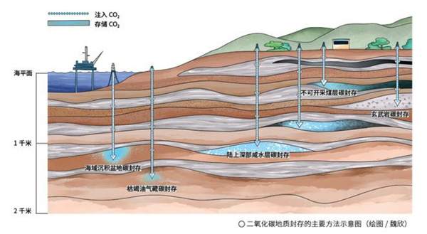 二氧化碳地质封存,是指通过工程技术手段,将工业源排放的二氧化碳捕集后,注入地下800~3500米深度范围内的陆上深部咸水层、枯竭油气藏、不可开采煤层、海底咸水层等地质构造中,再通过一系列的岩石物理束缚、溶解和矿化作用将其封存在地质体内。其中,陆上深部咸水层碳封存和枯竭油气藏碳封存技术现在最为成熟。