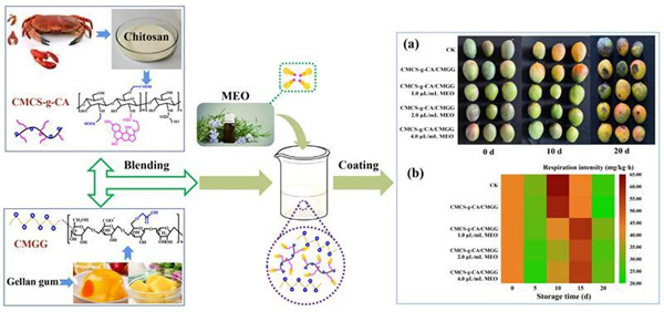 绿色高效的涂膜材料是开发涂膜保鲜剂的关键。壳聚糖是自然界存量最丰富的多糖之一,具有良好的生物相容性、可降解性、成膜性、阻隔性以及抗菌性,被认为是可食性涂膜保鲜的理想材料之一。但壳聚糖膜存在着成膜后机械性能差、抑菌性能不足等问题。结冷胶是一种天然微生物多糖,具有高透明、耐酸广、强稳定性、凝胶性、风味释放性、耐高温等性能,已广泛用于食品、日用品、药品等领域,结冷胶的引入能有效提高壳聚糖成膜后的机械性能。植物精油是一类植物源次生代谢产物,具有广谱、高效的抗菌活性,是公认的无公害天然防腐保鲜剂,不仅可以有效地提高涂膜材料的防腐抑菌效果,而且能改善涂膜的力学性能,产生协同增效作用。本研究将壳聚糖羧甲基改性后接入胆酸基团形成两亲性壳聚糖衍生物(CMCS-g-CA),使其具有良好的水溶性,以及与疏水性材料更好的相容性,然后与水溶性的羧甲基结冷胶(CMGG)进行复合,构建高分子涂膜保鲜材料。在这项工作中,为了获得具有最佳机械和阻隔性能的复合膜,通过对复合膜的透水透气性能以及力学性能进行表征,确定了CMCS-g-CA/CMGG的合适重量比为5:2。同时,添加了芥末精油(MEO)的CMCS-g-CA/CMGG/MEO复合膜对大肠杆菌、金黄色葡萄球菌和炭疽杆菌具有良好的抗菌性能,并且抗菌活性随着MEO用量的增加而逐渐增强。与未涂膜芒果样品相比,在室温下,用CMCS-g-CA/CMGG/MEO涂膜的芒果货架期延长了10天。这项研究表明,壳聚糖/结冷胶/植物精油复合材料可应用于开发具有高抗菌活性的食品保鲜包装材料,为绿色多功能水果保鲜材料的开发提供新的策略。