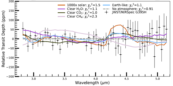 事实上,这次通过韦布的观测只是进一步确认了一个大小类似于地球的“类地行星”(岩石行星的一类)的存在性,并利用获得的透射光谱限制了它的大气类型。