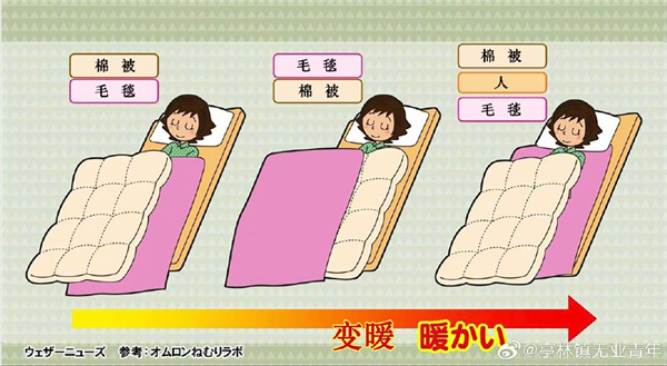 根据微博网友发布的图片,上盖棉被、下铺毛毯的“夹心盖法”最为保暖;其次是先盖一层棉被,再在棉被上盖一层毛毯;先盖毛毯,再盖棉被不如前两者暖和。