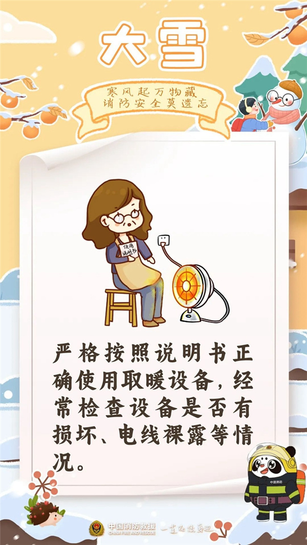 今日大雪,这是二十四节气中的第21个节气,也是冬季的第3个节气。大雪的到来,标志着仲冬时节正式开始,天气愈发寒冷,取暖同时防火十分重要,使用电器也一定注意消防安全,家中用电常识不能忘……看图了解吧