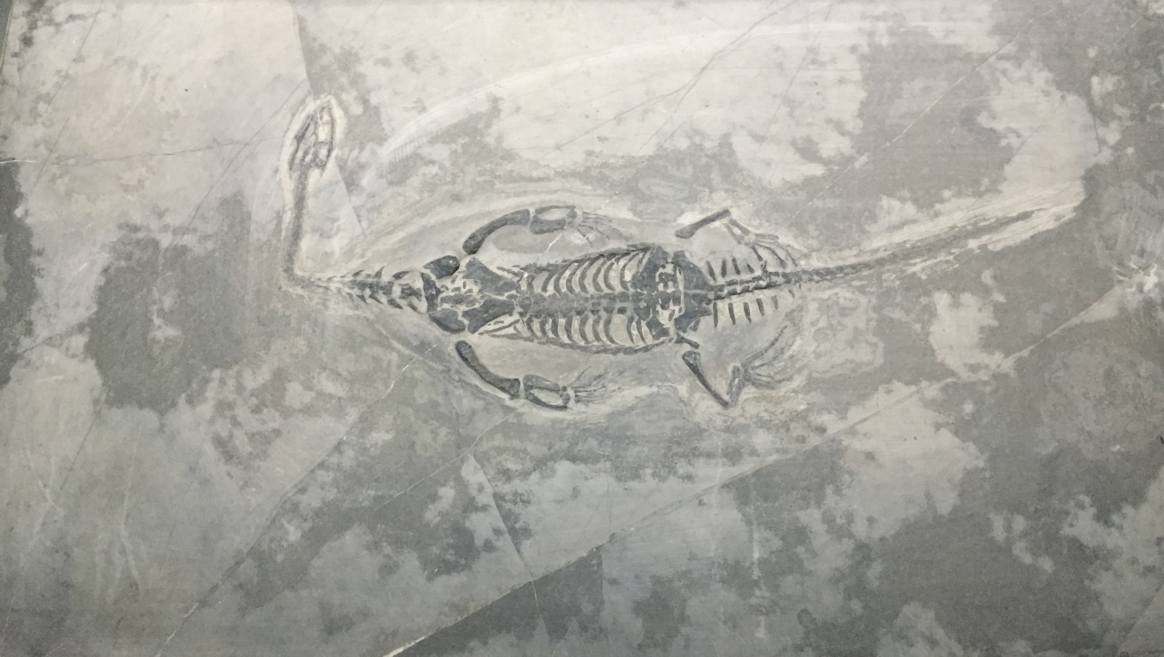 三叠纪兴义地区狭长的海槽为贵州龙提供了稳定而封闭的生活环境,使它们成为当地最繁盛也最具代表性的物种,但危机潜藏于安定之中,当兴义地区海平面下降时,海水循环不畅,低能缺氧的静水环境让它们迅速走向了灭绝之路。只有化石上灰黑-黑色的骨骼纹理以及围岩清晰的层纹构造,诉说着它们“窒息”的结局。