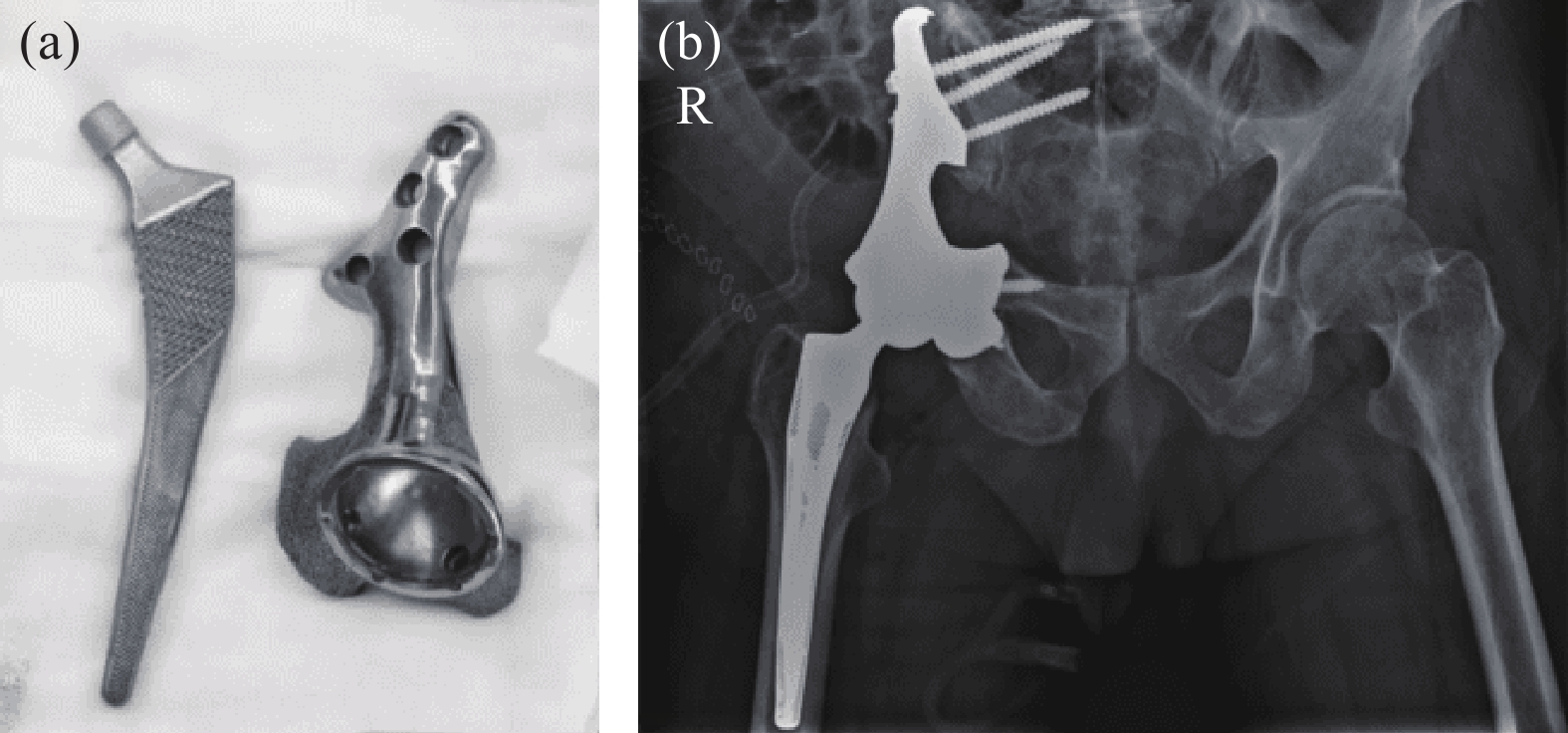 图10 3D打印钽金属骨盆和髋关节:(a)打印成品;(b)植入人体后X光照片[25]