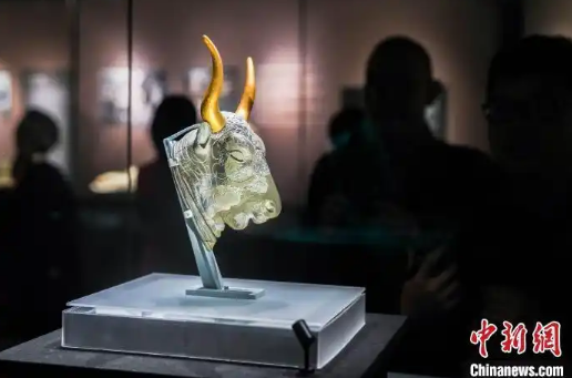 4月14日,“代达罗斯:希腊克里特岛的神话”特展在故宫博物院开幕,图为展览现场的公牛头形状来通杯。中新社记者 张祥毅 摄