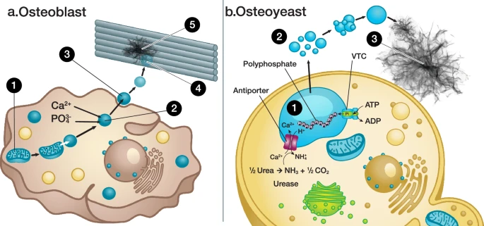 说干就干!科学家通过基因工程改造了一种常见的酵母菌,让它具备了类似成骨细胞的功能。接着,他们把从尿液中提取的尿素“喂”给这些酵母菌,后者随即启动了一套生物化学“流水线”,最终成功分泌出结晶状的羟基磷灰石。