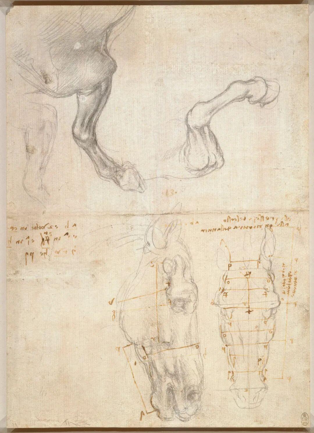 现存于温莎城堡皇家图书馆的数百张手稿证实了达芬奇进行了大量基于马体解剖的精准绘画,并展现出一套革命性的方法:从多个角度绘制同一结构,逐层剥离以显示深层构造,并配合文字注释进行功能推理。
