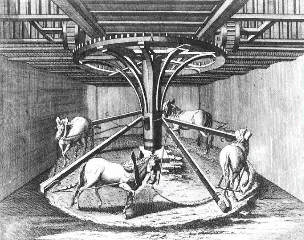 瓦特当时主要想要拿下位于伦敦的一家大型酿酒厂。酿酒最重要的就是麦芽粉,它是用大麦、小麦研磨制成,所以该厂用的是当时流行的做法——让数匹役马绕圈走,带动轴和齿轮干活,以此为磨具提供稳定的动力。