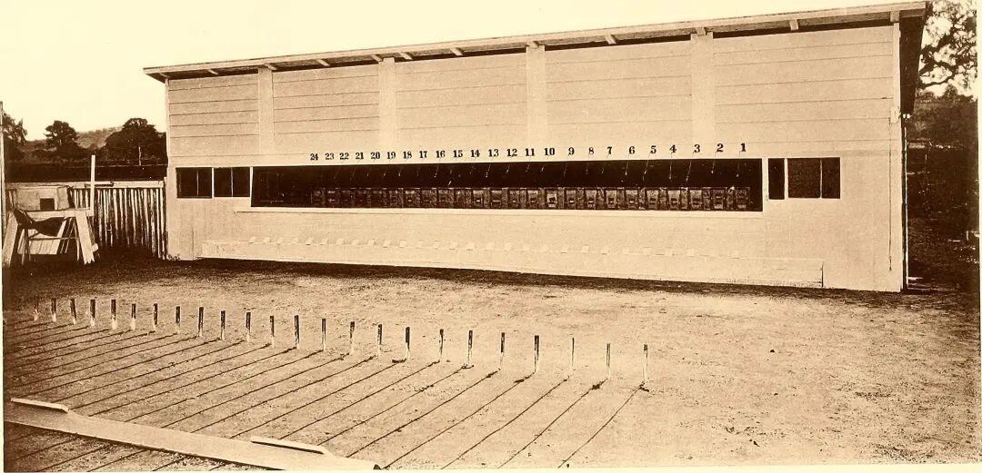 终于在1878年,迈布里奇获得了一个绝佳的灵感。他在帕洛阿尔托的赛马场边竖起了整整12台相机,后来倍增到24台。每台相机前拉着一根细绳,绳子另一头连着快门。当马沿着跑道飞奔而过时,身体依次撞断每一根绳子,就像敲击了一排看不见的门铃,相机会一台接一台地在极短时间内连续拍摄。