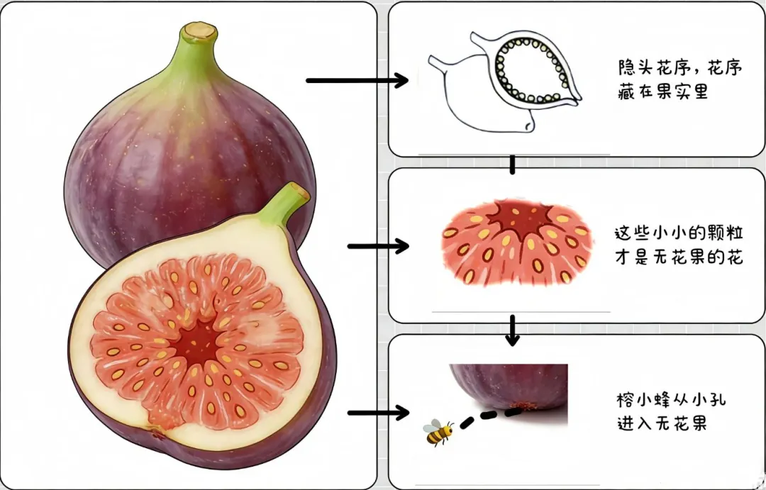 传入中国后,古人因见其似无花而结果,故称之为“无花果”。那么无花果真的无花吗?其实不然,只是它的花朵藏于果实内部,这种特殊的结构称为隐头花序。我们所见到的“果实”,实则是膨大的花托,内部包含着许多需要用放大镜才能看清的小花,食用的部分主要就是这些花。根据生活经验,大多数水果需经授粉才能结果,那无花果的花藏在内部,又该如何授粉呢?无花果自有妙招——它在花序顶端留有一个细小的孔洞,只有针尖大小的榕小蜂可以钻入其中完成授粉,从而顺利结果。