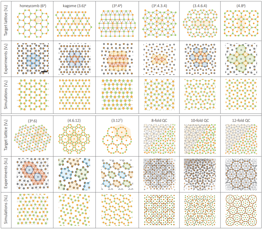 这一新范式在结合光镊技术的二维胶体实验和分子动力学模拟中均得到了验证。团队不仅成功实现了9种复杂阿基米德晶格的自组装,还将该方法推广到了具有8、10、12重旋转对称性的二维非周期准晶结构中,证明了DSG策略的有效性和普适性。