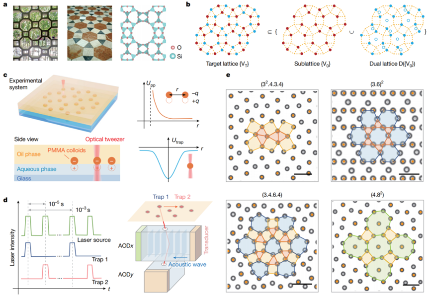 图1:(a) 建筑装饰与材料中的复杂对称性晶格结构;(b) 复杂晶格的对偶子晶格分解示意图;(c-d) 基于声-光耦合光镊技术的二维胶体实验系统;(e) 基于“对偶对称性引导”自组装范式构建的复杂胶体晶格。