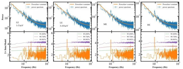 图4. 慧眼卫星三个仪器低能,中能,和高能探测器对88毫赫兹准周期振荡信号的独立探测。(图片摘自Yan, Rappisarda & Yu, 2021, ApJ,919,46)