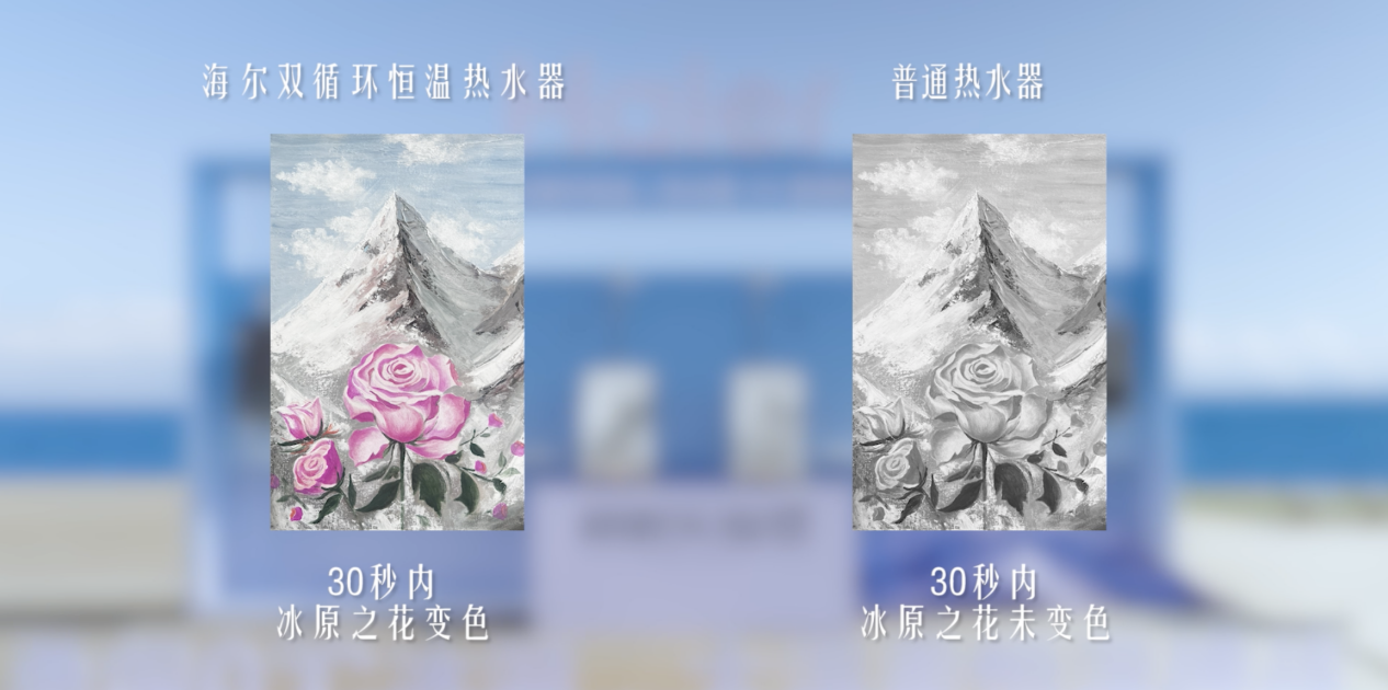 在开机零冷水的挑战中,通过将用两幅感温材料特制的画(遇到 42℃热水就会变色),挑战现场的热水器能否实现秒出热水,观察画中的冰原之花,能否迅速恢复艳丽色彩,满足用户开机即热,无冷水的需求。
