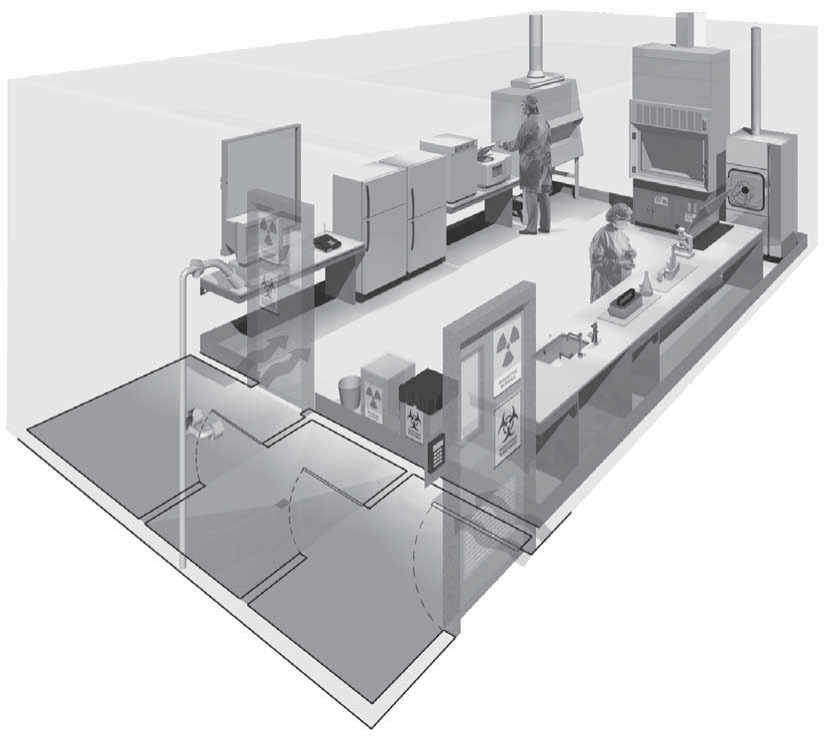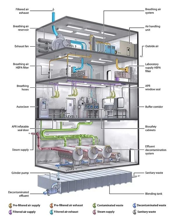 最高级别防护实验室,适用于处理对人体、动植物或环境具有高度危害性,通过气溶胶途径传播或传播途径不明,或未知的、高度危险的致病因子(没有预防和治疗措施)。