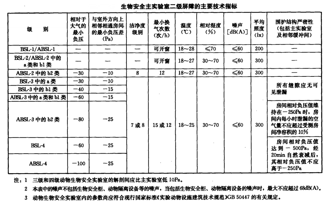 生物安全实验室二级屏障的主要技术指标如下图所示: