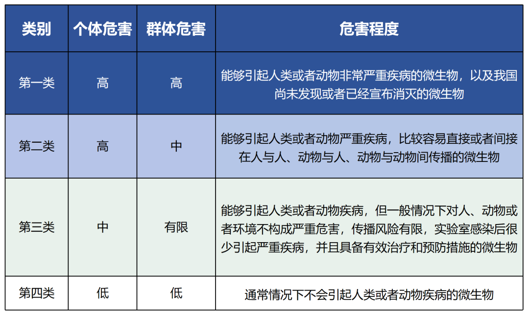 国家根据病原微生物的传染性、感染后对个体或者群体的危害程度,将病原微生物分为四类。其中,第一类病原微生物危害程度最高,第四类最低。