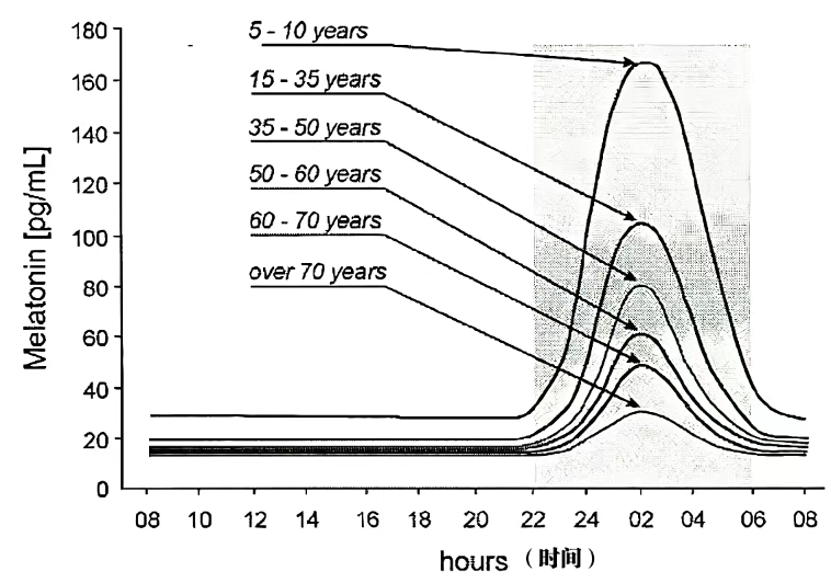 人在不同年龄,褪黑素的分泌量有很大差异:一般在青春期前,其分泌水平达到峰值;40岁后,分泌量随年龄增长逐渐下降;70岁时减至顶峰的1/4。