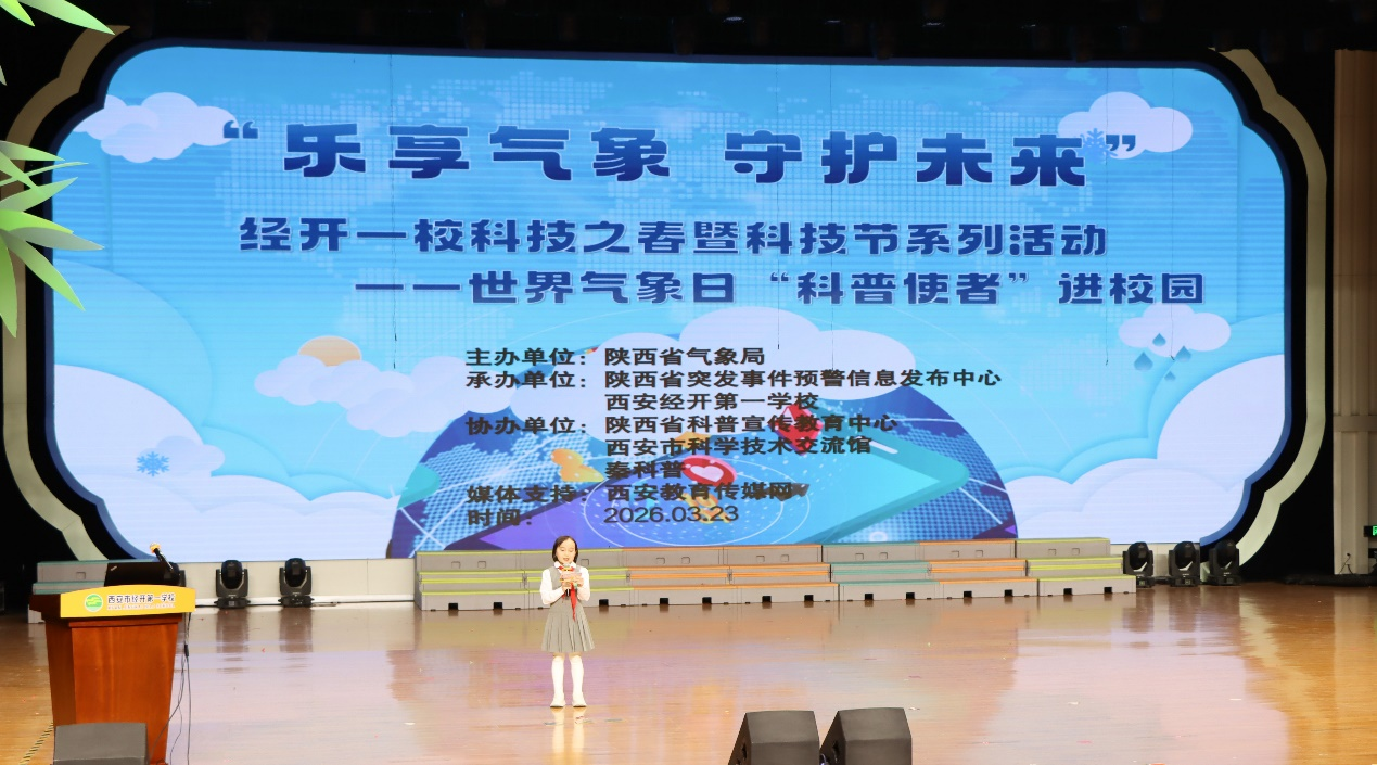 3月23日下午,西安市科普讲师团2026年世界气象日“乐享气象 守护未来”气象科普嘉年华,气象主播带您“探索风云变幻的气象世界”——“科普使者”进校园特色科普活动,在西安经开第一学校成功举办。活动由全国百优“金牌主播”,“全国优秀科普讲解人员”,“全国优秀科普使者”,“全国气象科普先进工作者”,“陕西优秀科普使者”,2023年“典赞·科普三秦”年度有影响力的“十大科普人物”,西安市科普讲师团专家讲师,陕西省气象局资深气象主播张静老师担任科普主讲。