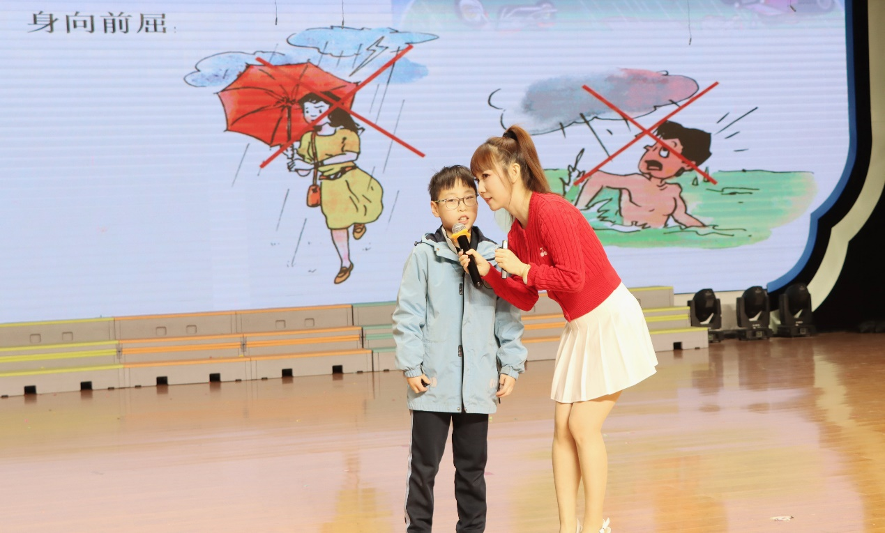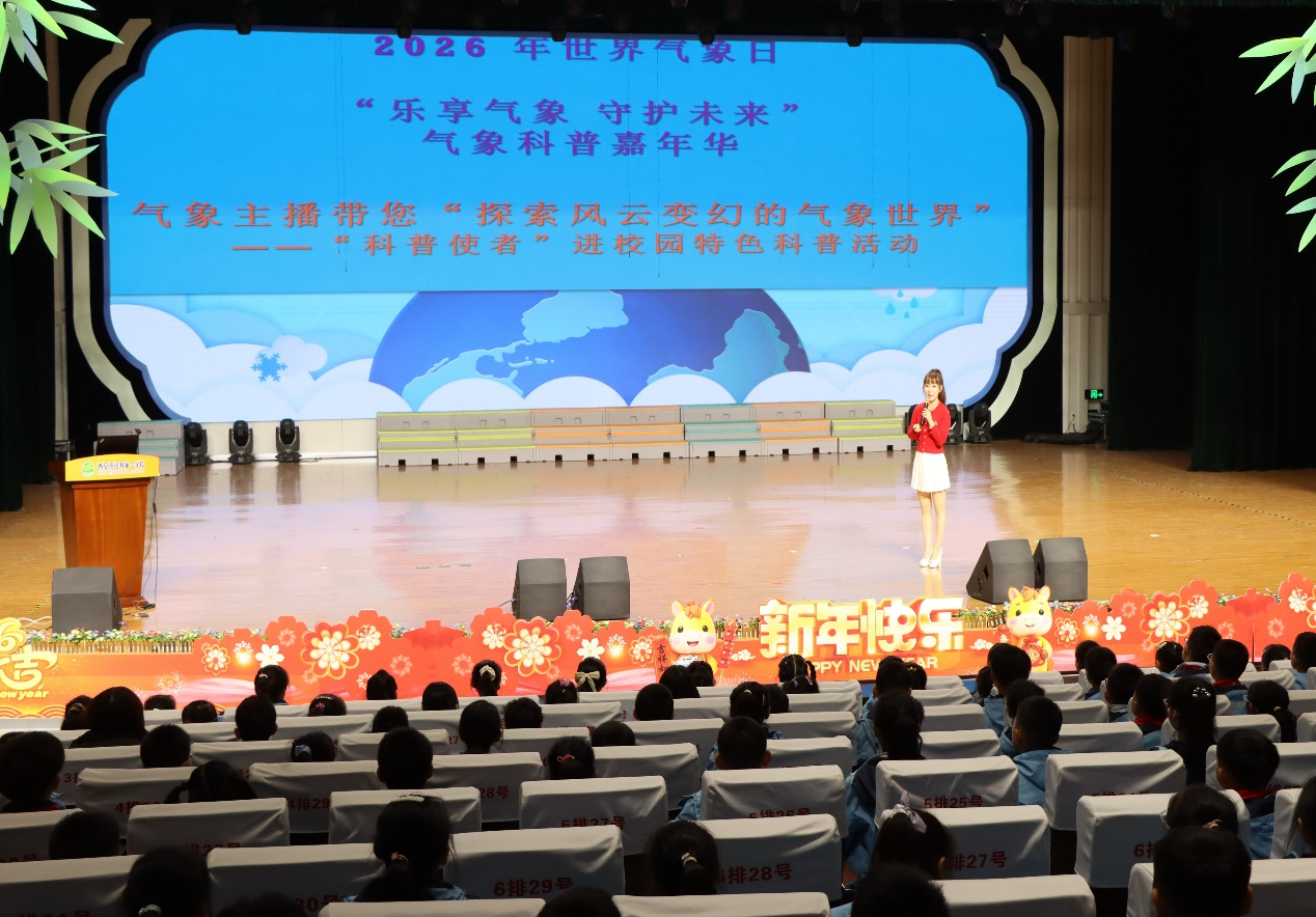 现场科普活动中,张静老师围绕感受气象科技的美妙与魅力“行动起来·减轻身边的灾害风险·保护地球母亲”——气象主播带您“观风云 识天气”“变身小小减灾官”为主题,借助精心制作的气象科普课件,用常见的天气现象,告诉大家什么是气象,引出世界气象日的来历和2026年世界气象日的主题“测今日气象,护明日家园”,为现场500多名学生和老师,带来了一次别样、趣味的气象科普讲座。